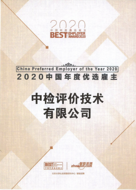 喜訊:中檢評價技術(shù)有限公司榮獲“2020中國年度優(yōu)選雇主”稱號!