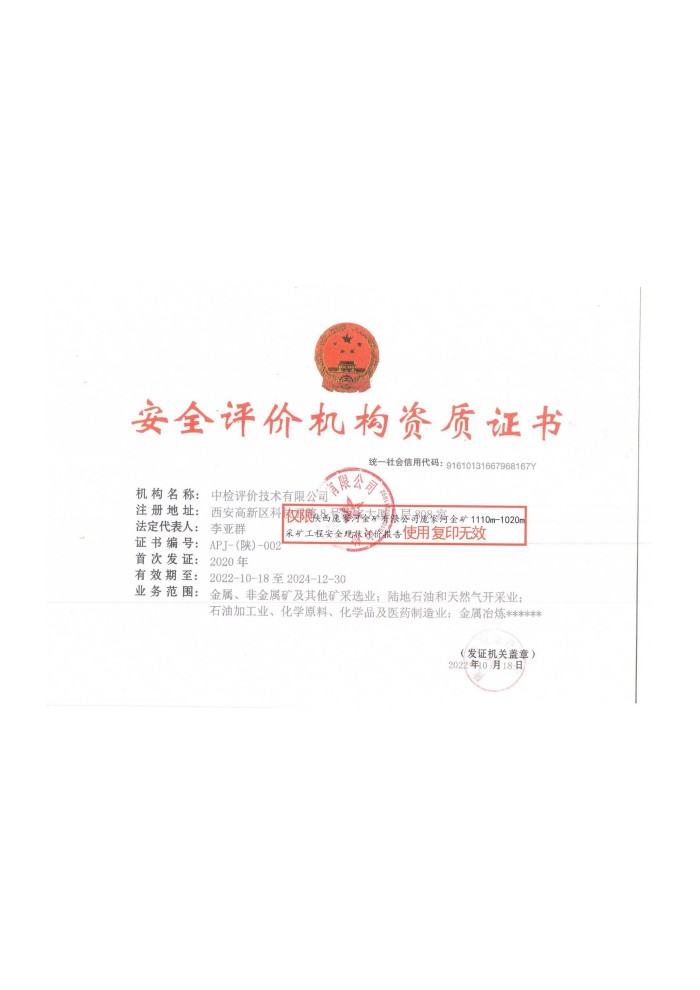 項(xiàng)目簡介 | 企業(yè)于2020年12月4日經(jīng)延續(xù)取得了由寶雞市應(yīng)急管理局頒發(fā)的安全生產(chǎn)許可證(陜寶)FM 安許證字[0092](許可范圍:金礦地下開采標(biāo)高(1110m-1020m)),有效期自2020年12月4日至2023年3月12日,礦山現(xiàn)處于邊探邊采、并利用早期遺留貧礦、邊角料的狀態(tài),企業(yè)于2016年7月22日已取得《關(guān)于劃定陜西龐家河金礦(深部及外圍)礦區(qū)范圍的批復(fù)》(陜國土資礦采劃[2016]34號),在現(xiàn)有采礦證深部、西側(cè)、東側(cè)新增了資源儲量,并于2022年7月13日取得了由陜西省自然資源廳新頒發(fā)的采礦許可證(C6100002010064120067696),年生產(chǎn)規(guī)模變?yōu)?/span>10萬噸,礦區(qū)面積變?yōu)?/span>0.4425km2,開采深度由800米至1400m。 本報告認(rèn)為陜西龐家河金礦有限公司龐家河金礦1110m-1020m采礦工程生產(chǎn)運(yùn)營狀況符合國家相關(guān)法律法規(guī)、技術(shù)標(biāo)準(zhǔn)的規(guī)定,安全設(shè)施能滿足礦山安全生產(chǎn)的要求。礦山目前存在的風(fēng)險在采取相應(yīng)對策措施后風(fēng)險可以控制,風(fēng)險程度可以接受。 評價認(rèn)為:陜西龐家河金礦有限公司龐家河金礦1110m-1020m采礦工程從安全角度符合國家相關(guān)法律法規(guī)、技術(shù)標(biāo)準(zhǔn)的規(guī)定,具備安全生產(chǎn)條件。 | ||||||
