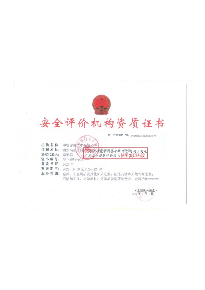 報(bào)告結(jié)論 | 綜上所述,依據(jù)國家相關(guān)法律、法規(guī)和技術(shù)標(biāo)準(zhǔn),陜西龐家河金礦有限公司洞子溝尾礦庫主要安全設(shè)施整體安全現(xiàn)狀良好,尾礦壩的穩(wěn)定性、排洪系統(tǒng)的能力滿足規(guī)范要求。因此,洞子溝尾礦庫生產(chǎn)條件可以滿足國家有關(guān)法律、法規(guī)、標(biāo)準(zhǔn)、規(guī)章、規(guī)范的要求,陜西龐家河金礦有限公司洞子溝尾礦庫具備安全生產(chǎn)條件。 | ||||||