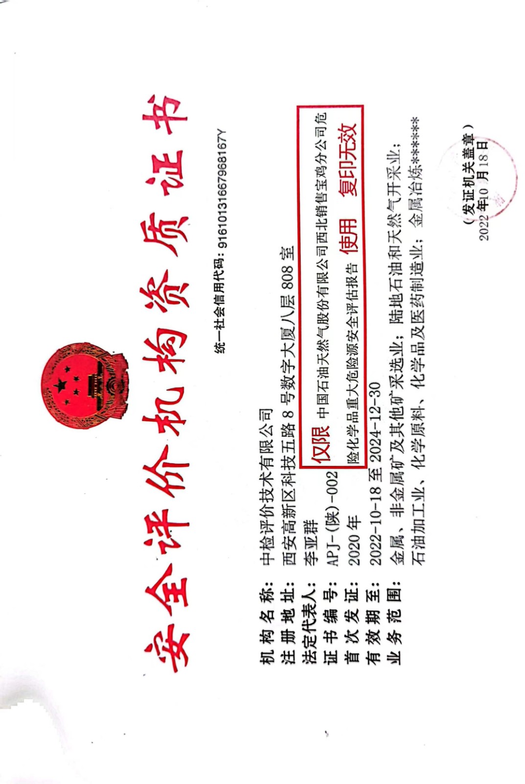 機構(gòu)名稱 | 中檢評價技術(shù)有限公司 | 資質(zhì)證號 | APJ-(陜)-002 | |||