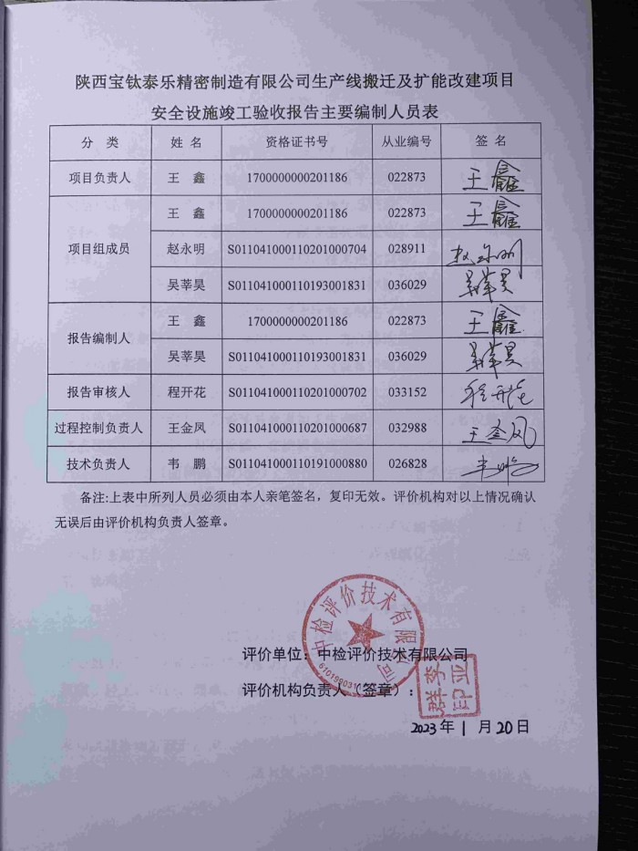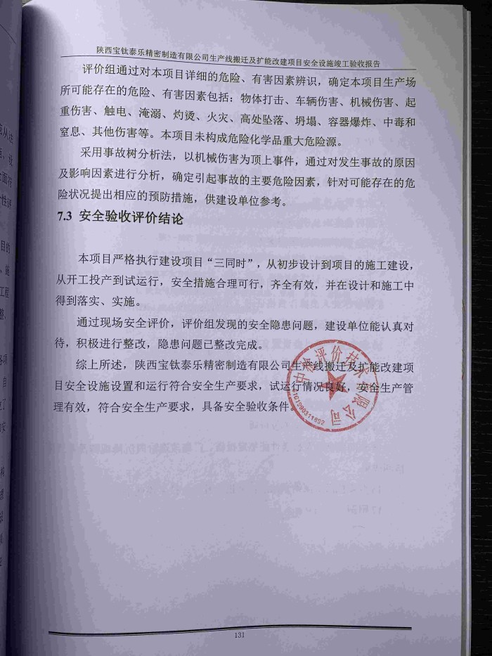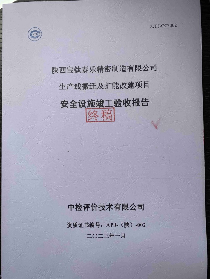 陜西寶鈦泰樂精密制造有限公司生產(chǎn)線搬遷及擴(kuò)能改建項(xiàng)目 安全設(shè)施竣工驗(yàn)收