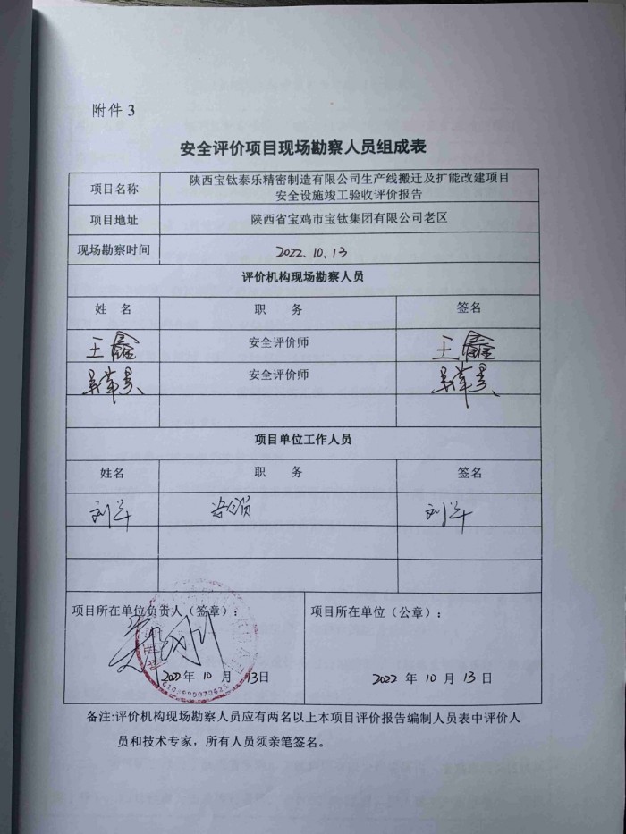 項(xiàng)目名稱 | 陜西寶鈦泰樂精密制造有限公司生產(chǎn)線搬遷及擴(kuò)能改建項(xiàng)目 安全設(shè)施竣工驗(yàn)收 | ||||||