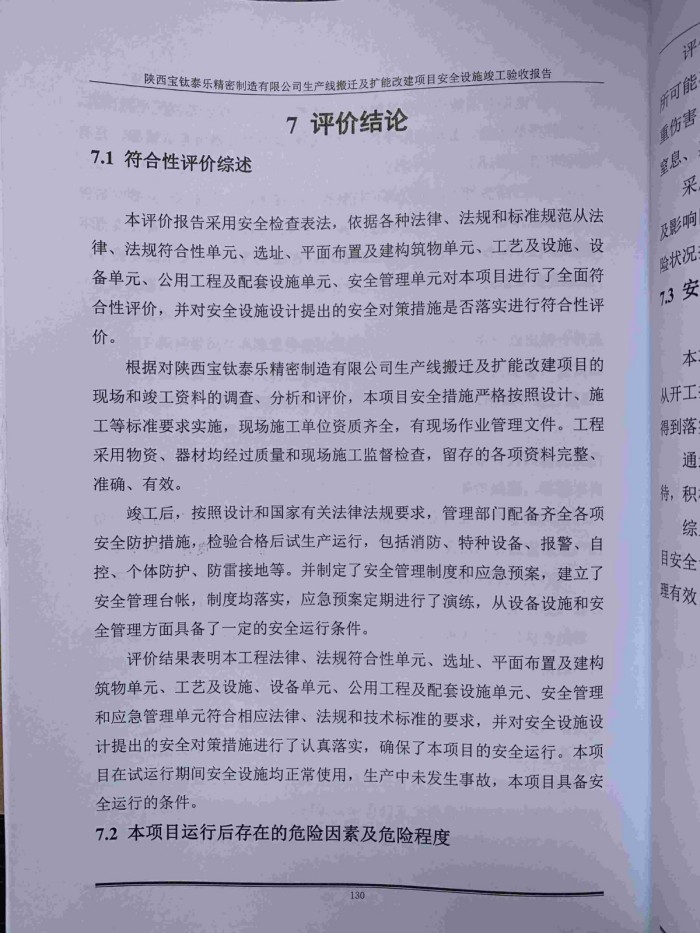 項(xiàng)目簡介 | 建設(shè)單位:陜西寶鈦泰樂精密制造有限公司 法人代表:鄭剛 項(xiàng)目地點(diǎn):陜西省寶雞市寶鈦集團(tuán)有限公司老區(qū) 評價(jià)結(jié)論:陜西寶鈦泰樂精密制造有限公司生產(chǎn)線搬遷及擴(kuò)能改建項(xiàng)目安全設(shè)施設(shè)置和運(yùn)行符合安全生產(chǎn)要求,試運(yùn)行情況良好,安全生產(chǎn)管理有效,符合安全生產(chǎn)要求,具備安全驗(yàn)收條件。 | ||||||