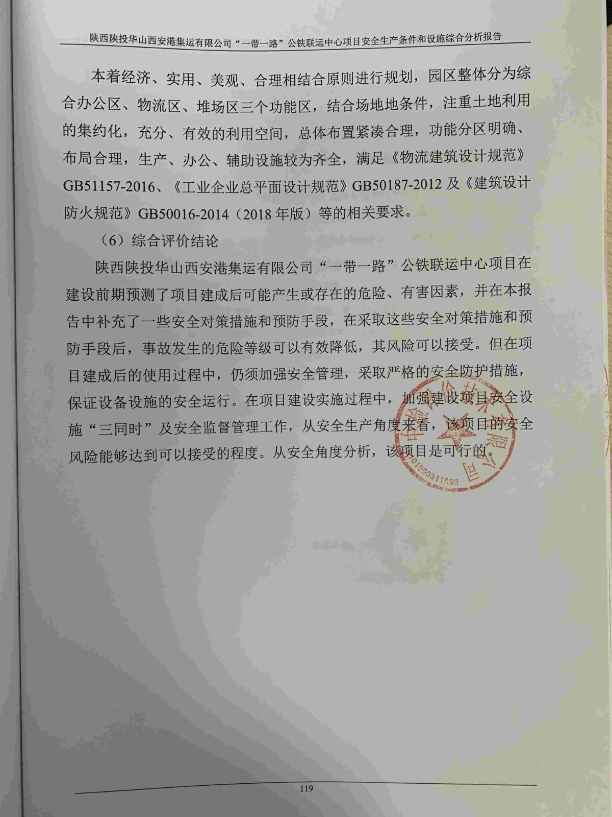 報(bào)告結(jié)論 | 陜西陜投華山西安港集運(yùn)有限公司“一帶一路”公鐵聯(lián)運(yùn)中心項(xiàng)目在建設(shè)前期預(yù)測了項(xiàng)目建成后可能產(chǎn)生或存在的危險(xiǎn)、有害因素,并在本報(bào)告中補(bǔ)充了一些安全對策措施和預(yù)防手段,在采取這些安全對策措施和預(yù)防手段后,事故發(fā)生的危險(xiǎn)等級(jí)可以有效降低,其風(fēng)險(xiǎn)可以接受。但在項(xiàng)目建成后的使用過程中,仍須加強(qiáng)安全管理,采取嚴(yán)格的安全防護(hù)措施,保證設(shè)備設(shè)施的安全運(yùn)行。在項(xiàng)目建設(shè)實(shí)施過程中,加強(qiáng)建設(shè)項(xiàng)目安全設(shè)施“三同時(shí)”及安全監(jiān)督管理工作,從安全生產(chǎn)角度來看,該項(xiàng)目的安全風(fēng)險(xiǎn)能夠達(dá)到可以接受的程度。從安全角度分析,該項(xiàng)目是可行的。 | ||||||