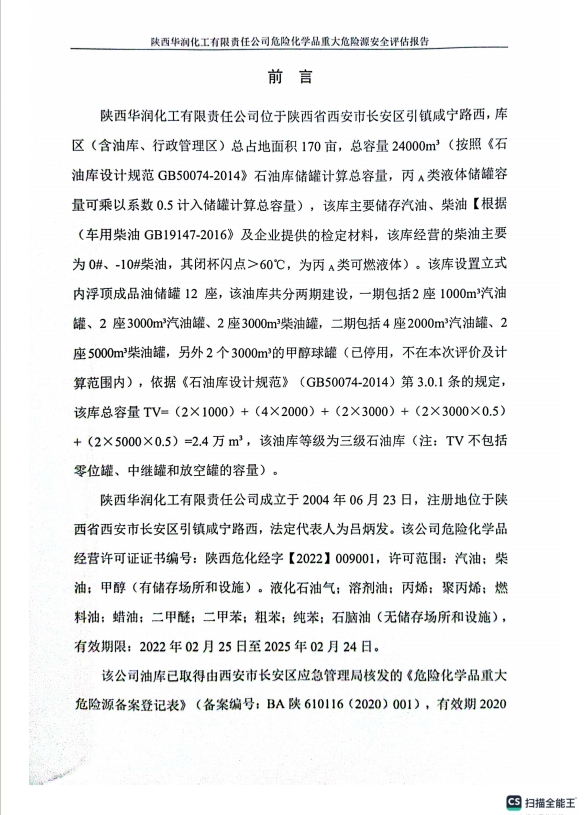 項目簡介 | 陜西華潤化工有限責任公司位于陜西省西安市長安區(qū)引鎮(zhèn)咸寧路西,庫區(qū)(含油庫、行政管理區(qū))總占地面積170畝,總?cè)萘?4000立方米(按照《石油庫設(shè)計規(guī)范GB50074-2014》石油庫儲罐計算總?cè)萘縏V,丙A類液體儲罐容量可乘以系數(shù)0.5計入儲罐計算總?cè)萘浚?,該庫主要以儲存汽油、柴油【根?jù)《車用柴油GB19147-2016》及企業(yè)提供的檢定材料,該庫經(jīng)營的柴油主要為0#、-10#柴油,其閉杯閃點>60℃,為丙A類可燃液體】。該庫設(shè)置立式內(nèi)浮頂成品油儲罐 12 座,該油庫共分兩期建設(shè),一期包括: 2個1000m3汽油罐、2 個 3000m3汽油罐、2個 3000m3柴油罐,二期包括4個 2000m3汽油罐、 2個 5000m3柴油罐,另外2個 3000m3的甲醇球罐(已停用,不在本次評價及計算范圍內(nèi)),依據(jù)《石油庫設(shè)計規(guī)范》(GB50074-2014)第3.0.1條的規(guī)定,該庫總?cè)萘縏V=(2×1000)+(4×2000)+(2×3000)+(2×3000×0.5)+(2×5000×0.5)=2.4萬m3,該油庫等級為三級石油庫(注:TV不包括零位罐、中繼罐和放空罐的容量)。 陜西華潤化工有限責任公司成立于2004年06月23日,注冊地位于陜西省西安市長安區(qū)引鎮(zhèn)咸寧路西,法定代表人為呂炳發(fā)。該公司危險化學品經(jīng)營許可證證書編號:陜西危化經(jīng)字【2022】009001,許可范圍:汽油;柴油;甲醇(有儲存場所和設(shè)施)。液化石油氣;溶劑油;丙烯;聚丙烯;燃料油;蠟油;二甲醚;二甲苯;粗苯;純苯;石腦油(無儲存場所和設(shè)施),有效期限:2022年02月25日至2025年02月24日。 該公司油庫已取得由西安市長安區(qū)應(yīng)急管理局核發(fā)的《危險化學品重大危險源備案登記表》(備案編號:BA陜610116(2020)001),有效期2020年9月26日-2023年9月25日。 根據(jù)《危險化學品重大危險源監(jiān)督管理暫行規(guī)定》(國家安全生產(chǎn)監(jiān)督管理總局令第40號,79號令修改版)等有關(guān)規(guī)定,以及陜西省應(yīng)急管理廳有關(guān)文件的要求,陜西華潤化工有限責任公司委托中檢評價技術(shù)有限公司對該公司危險化學品重大危險源進行安全評估。 | ||||||