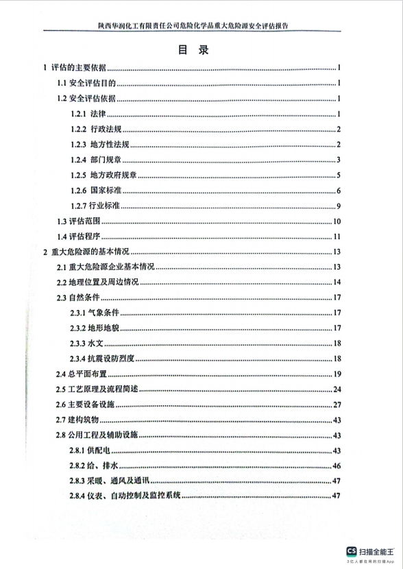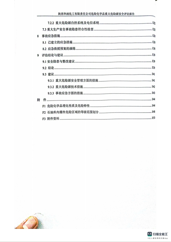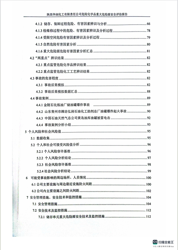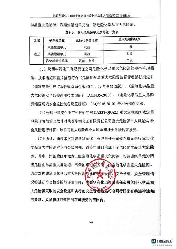 報告結(jié)論 | 陜西華潤化工有限責任公司危險化學品重大危險源采取的安全設(shè)施和實行的安全管理措施符合現(xiàn)行國家有關(guān)法律法規(guī)的要求,風險程度能夠控制在可接受的范圍內(nèi)。 | ||||||