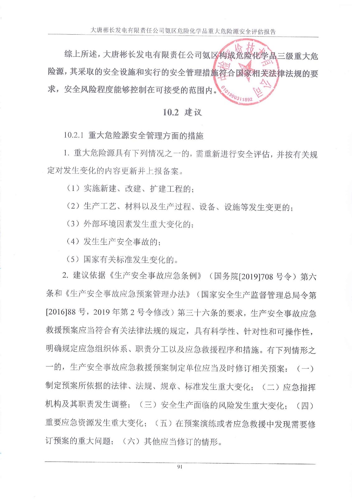 報告結(jié)論 | 大唐彬長發(fā)電有限責任公司氨區(qū)構(gòu)成危險化學(xué)品三級重大危險源,其采取的安全設(shè)施和實行的安全管理措施符合國家相關(guān)法律法規(guī)的要求,安全風(fēng)險程度能夠控制在可接受的范圍內(nèi)。 | ||||||