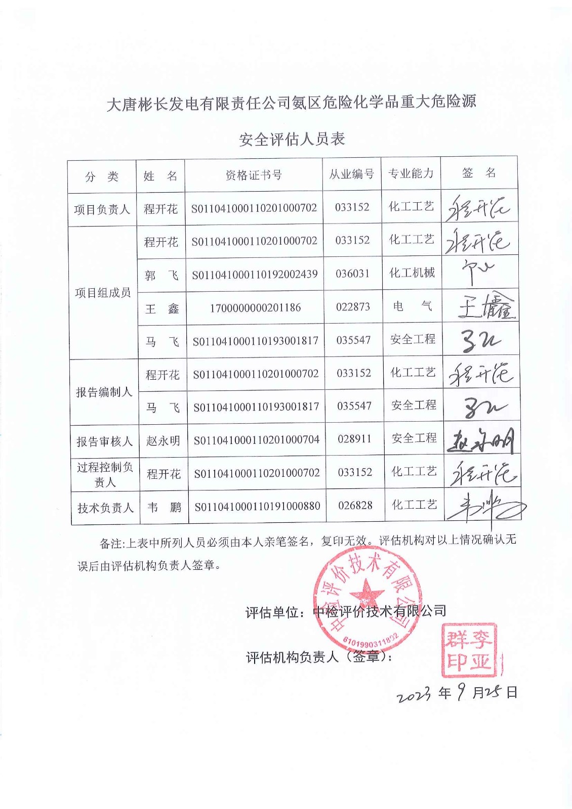 安全評價項目管理 | 項目組長 | 技術(shù)負責人 | 過程控制負責人 | ||||