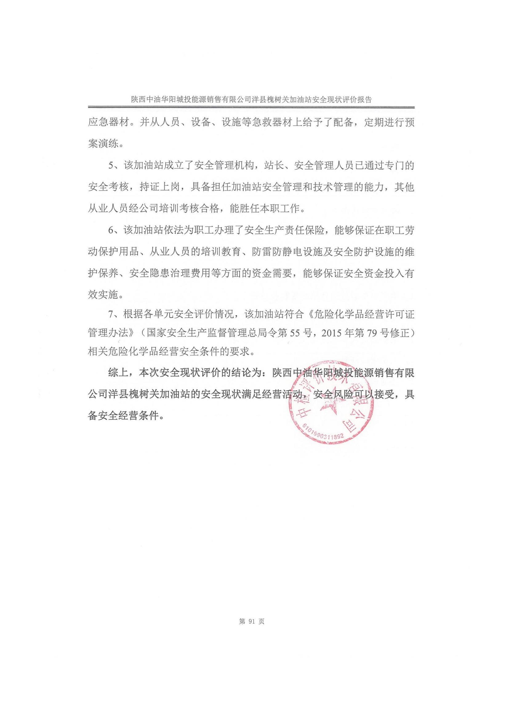 報告結(jié)論 | 本次安全現(xiàn)狀評價的結(jié)論為:陜西中油華陽城投能源銷售有限公司洋縣槐樹關加油站的安全現(xiàn)狀滿足經(jīng)營活動,安全風險可以接受,具備安全經(jīng)營條件。 | ||||||