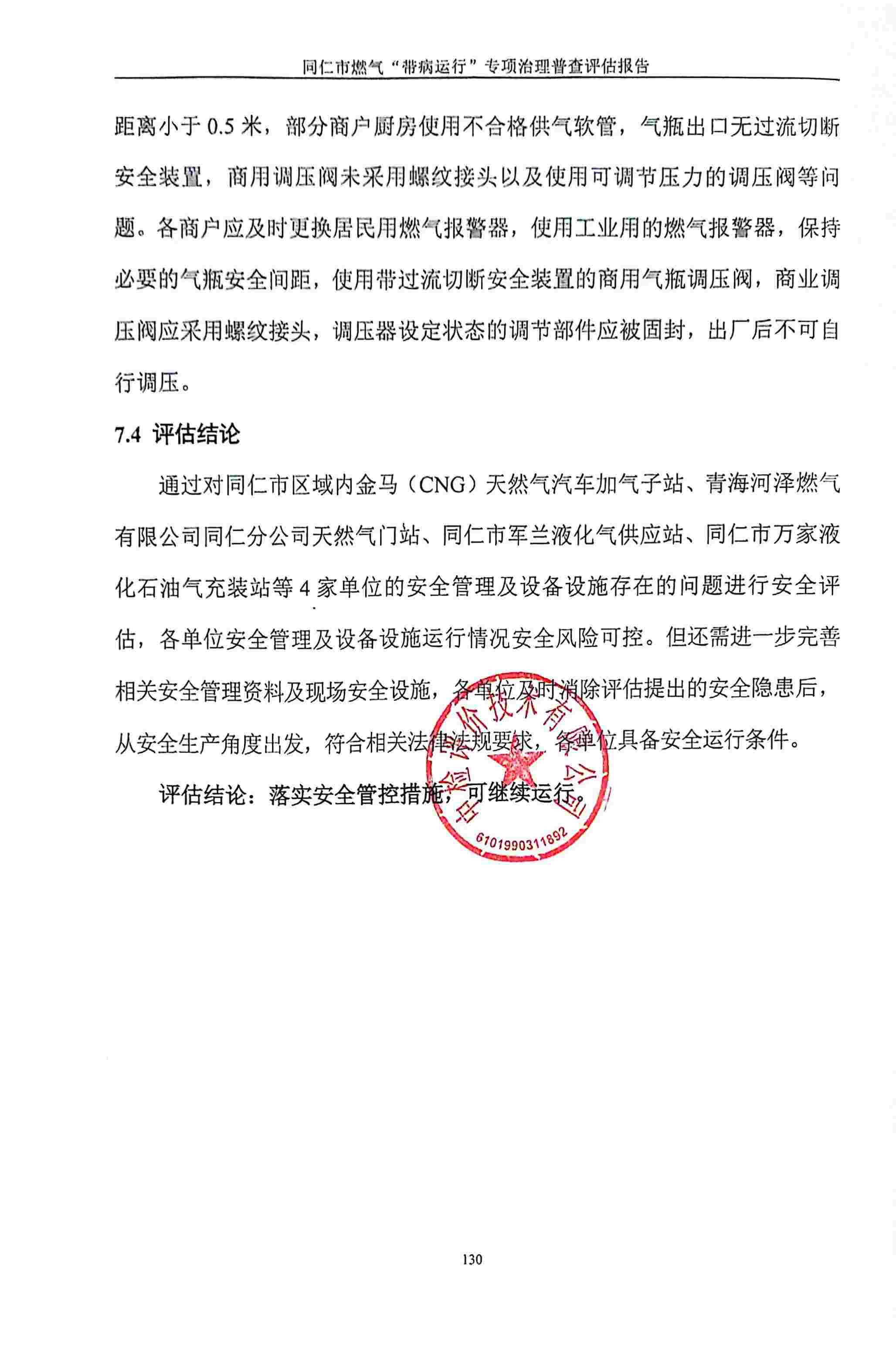 報(bào)告結(jié)論 | 通過對(duì)同仁市區(qū)域內(nèi)金馬(CNG)天然氣汽車加氣子站、青海河澤燃?xì)庥邢薰就史止咎烊粴忾T站、同仁市軍蘭液化氣供應(yīng)站、同仁市萬(wàn)家液化石油氣充裝站等4家單位的安全管理及設(shè)備設(shè)施存在的問題進(jìn)行安全評(píng)估,各單位安全管理及設(shè)備設(shè)施運(yùn)行情況安全風(fēng)險(xiǎn)可控。但還需進(jìn)一步完善相關(guān)安全管理資料及現(xiàn)場(chǎng)安全設(shè)施,各單位及時(shí)消除評(píng)估提出的安全隱患后,從安全生產(chǎn)角度出發(fā),符合相關(guān)法律法規(guī)要求,各單位具備安全運(yùn)行條件。 評(píng)估結(jié)論:落實(shí)安全管控措施,可繼續(xù)運(yùn)行。 | ||||||