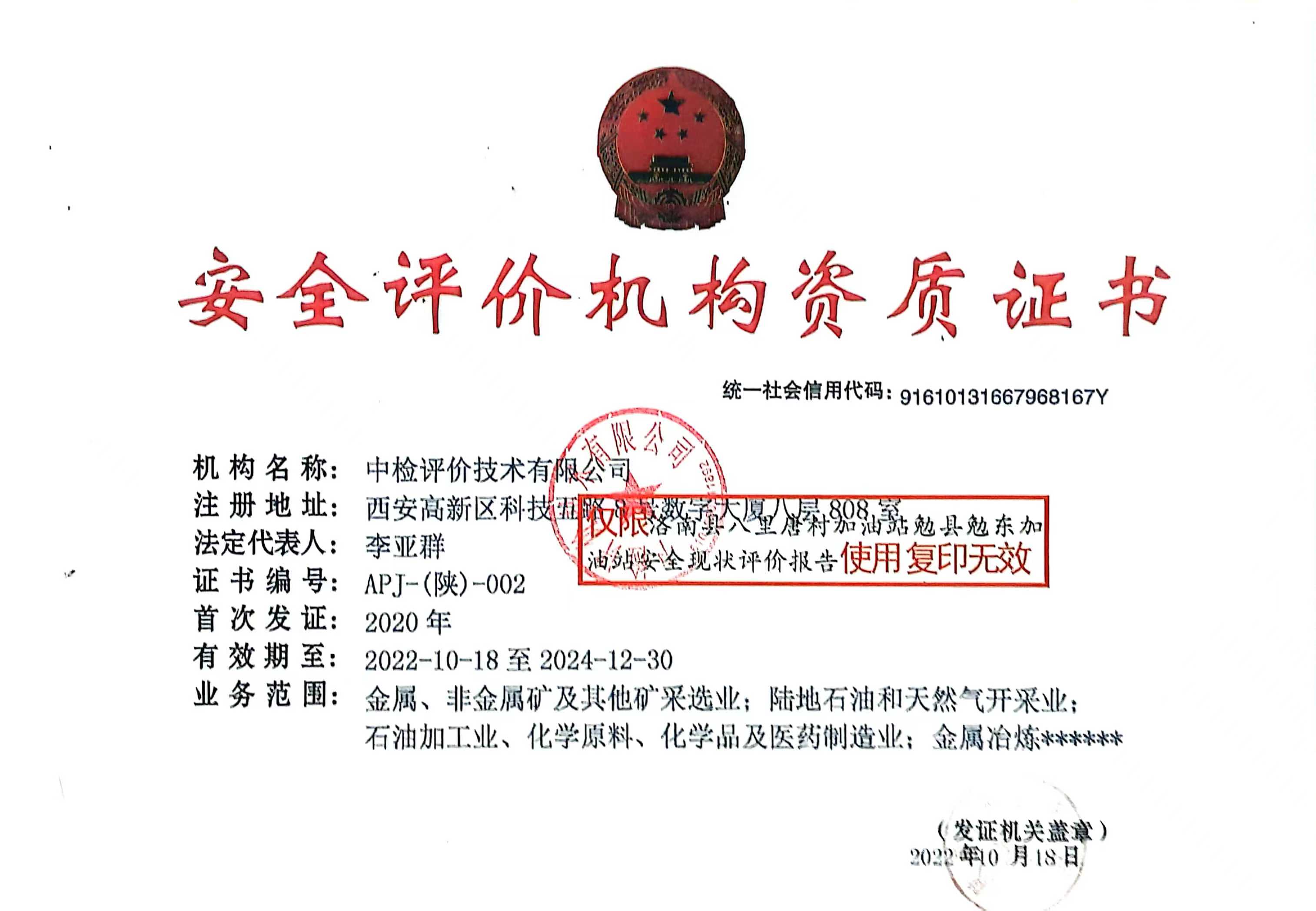 機構(gòu)名稱 | 中檢評價技術(shù)有限公司 | 資質(zhì)證號 | APJ-(陜)-002 | ||||