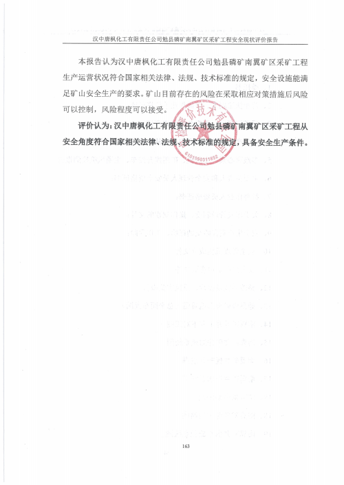 報(bào)告結(jié)論 | 漢中唐楓化工有限責(zé)任公司勉縣磷礦南翼礦區(qū)采礦工程從安全角度符合國(guó)家相關(guān)法律、法規(guī)、技術(shù)標(biāo)準(zhǔn)的規(guī)定,具備安全生產(chǎn)條件。 | ||||||