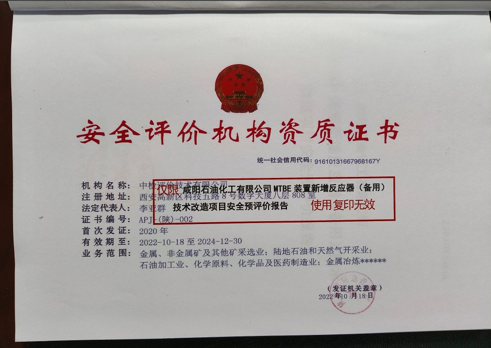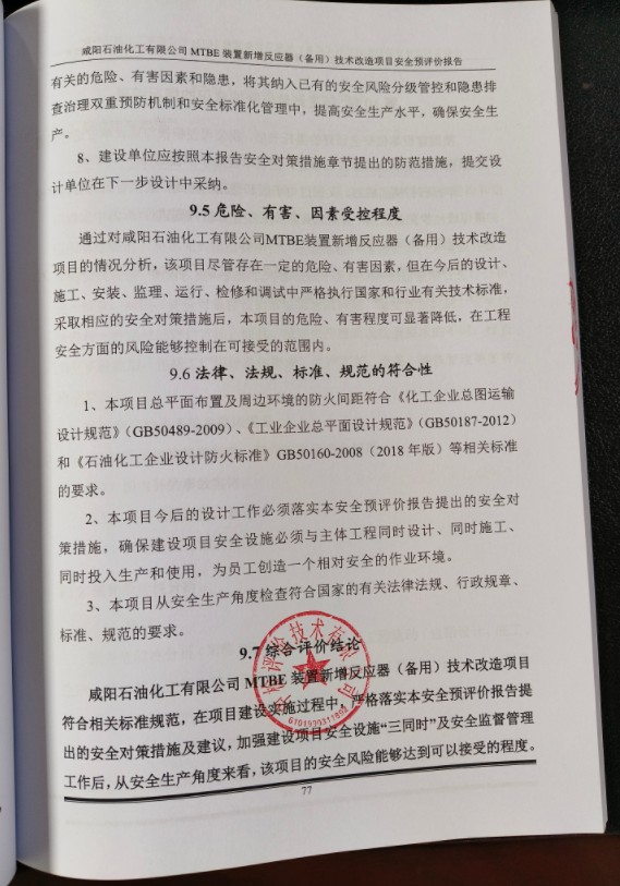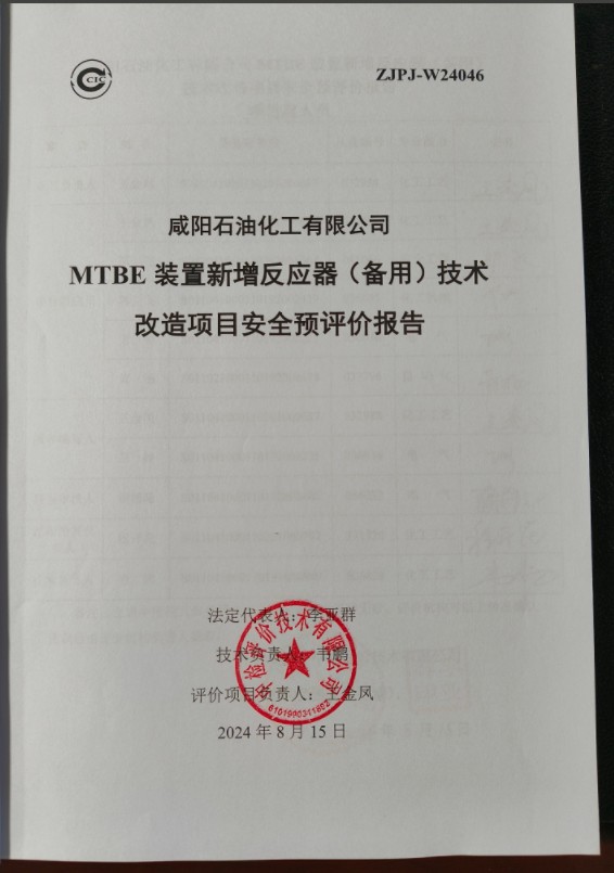 咸陽石油化工有限公司MTBE裝置新增反應(yīng)器(備用)技術(shù)改造項(xiàng)目安全預(yù)評(píng)價(jià)報(bào)告