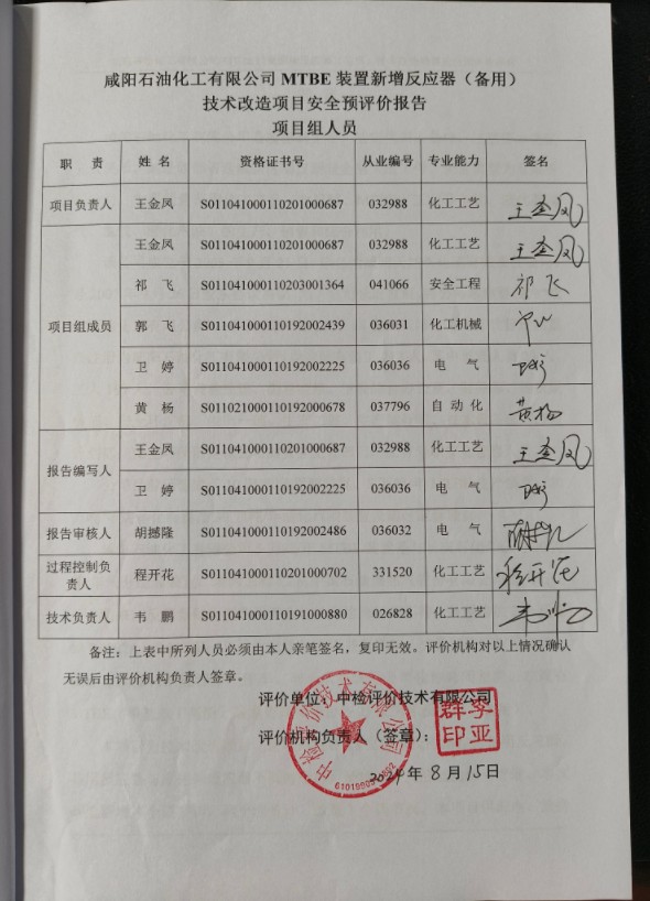 項(xiàng)目名稱 | 咸陽石油化工有限公司MTBE裝置新增反應(yīng)器(備用)技術(shù)改造項(xiàng)目安全預(yù)評(píng)價(jià)報(bào)告 | |||||||