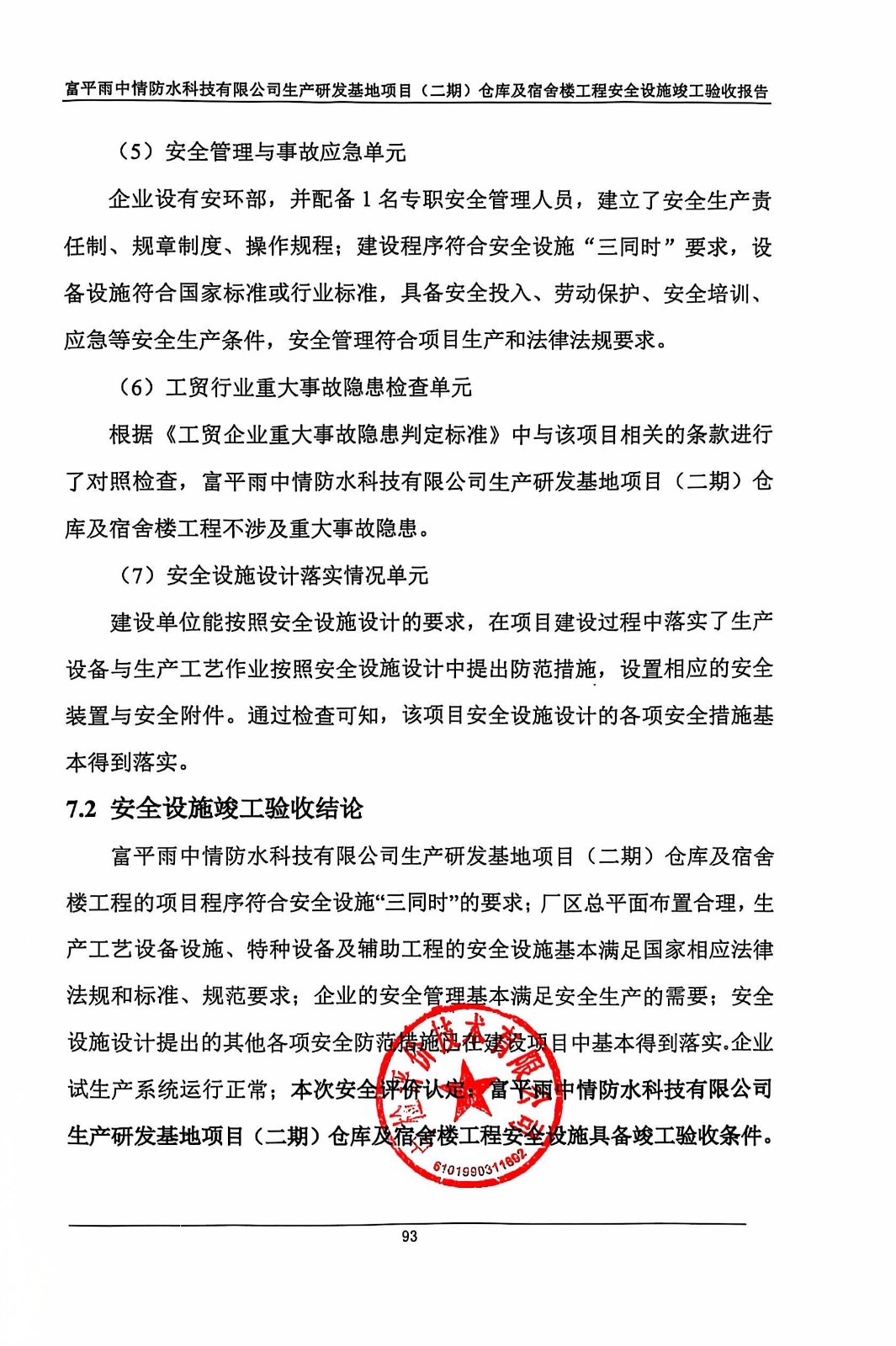 項目簡介 | 項目名稱:富平雨中情防水科技有限公司生產(chǎn)研發(fā)基地項目(二期)倉庫及宿舍樓工程;項目地點:陜西省渭南市富平縣莊里試驗區(qū)莊長路北段西側(cè)富平雨中情防水科技有限公司廠區(qū)內(nèi);建設(shè)規(guī)模及內(nèi)容:生產(chǎn)研發(fā)基地項目(二期)倉庫及宿舍樓工程的選址及總平面布置、生產(chǎn)工藝及設(shè)備設(shè)施、配套輔助設(shè)施和公用工程以及安全管理等內(nèi)容。具體范圍包括:丙類倉庫7座(3#、4#、5#、6#、7#、8#、9#倉庫)、丙類聯(lián)合廠房1座(5#車間及其附屬倉庫)及宿舍樓1棟。該項目供配電、給排水、消防供水等公輔設(shè)施均依托一期項目已建成的設(shè)施,安全設(shè)施竣工驗收僅對公輔設(shè)施的配套適應(yīng)性進行評價說明。針對丙類聯(lián)合廠房(5#車間及其附屬倉庫)實際建設(shè)情況,本次僅對廠房主體(包含附屬車間的成品儲存)的安全設(shè)施進行竣工驗收,驗收范圍不包括高分子防水卷材生產(chǎn)線。 評價結(jié)論:本次安全評價認(rèn)定:富平雨中情防水科技有限公司生產(chǎn)研發(fā)基地項目(二期)倉庫及宿舍樓工程安全設(shè)施具備竣工驗收條件。 | ||||||