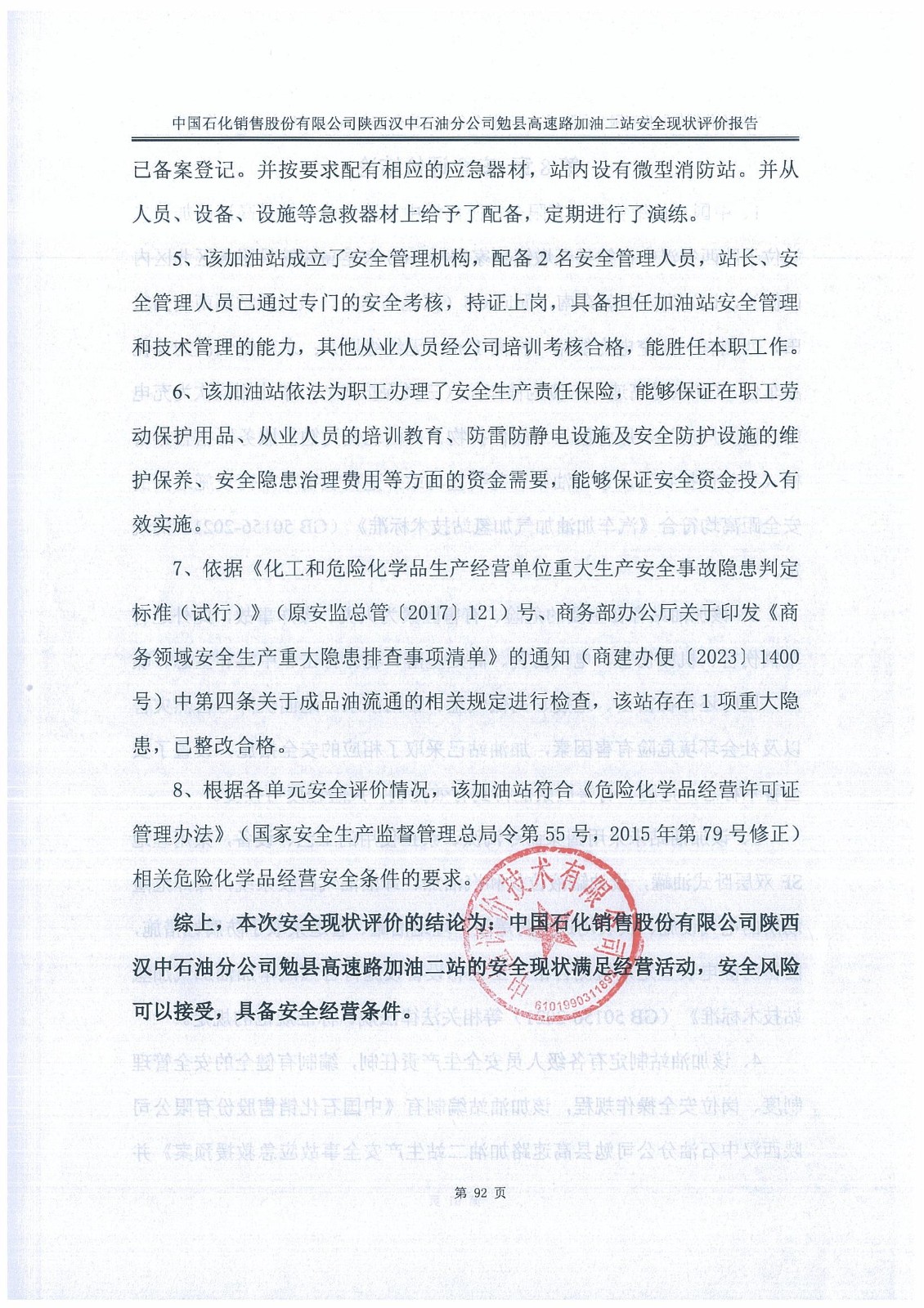 報告結(jié)論 | 本次安全現(xiàn)狀評價的結(jié)論為:中國石化銷售股份有限公司陜西漢中石油分公司勉縣高速路加油二站的安全現(xiàn)狀滿足經(jīng)營活動,安全風(fēng)險可以接受,具備安全經(jīng)營條件。 | ||||||