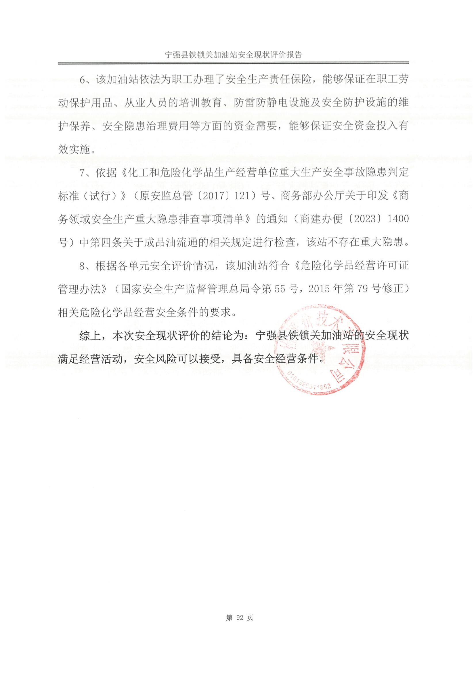 報(bào)告結(jié)論 | 本次安全現(xiàn)狀評(píng)價(jià)的結(jié)論為:寧強(qiáng)縣鐵鎖關(guān)加油站的安全現(xiàn)狀滿足經(jīng)營(yíng)活動(dòng),安全風(fēng)險(xiǎn)可以接受,具備安全經(jīng)營(yíng)條件。 | ||||||
