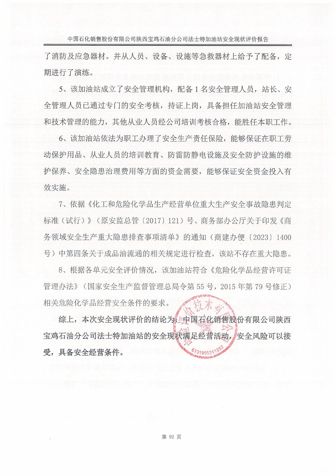 報告結(jié)論 | 本次安全現(xiàn)狀評價的結(jié)論為:中國石化銷售股份有限公司陜西寶雞石油分公司法士特加油站的安全現(xiàn)狀滿足經(jīng)營活動,安全風(fēng)險可以接受,具備安全經(jīng)營條件。 | ||||||