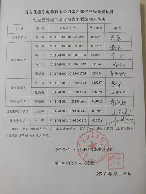 項(xiàng)目名稱 | 西安艾德樂電器有限公司熔斷器生產(chǎn)線新建項(xiàng)目安全設(shè)施竣工驗(yàn)收 | ||||||