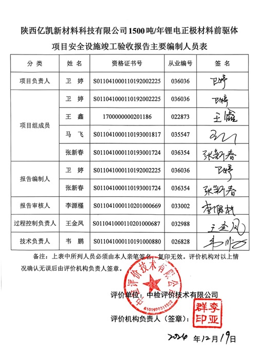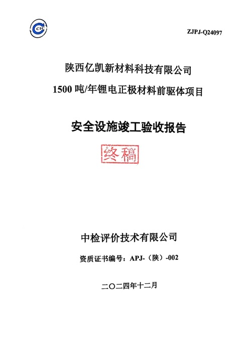 項(xiàng)目名稱 | 陜西億凱新材料科技有限公司1500噸/年鋰電正極材料前驅(qū)體項(xiàng)目 安全設(shè)施竣工驗(yàn)收 | ||||||
