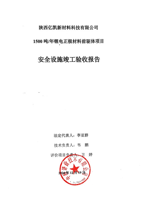 陜西億凱新材料科技有限公司1500噸/年鋰電正極材料前驅(qū)體項(xiàng)目安全設(shè)施竣工驗(yàn)收