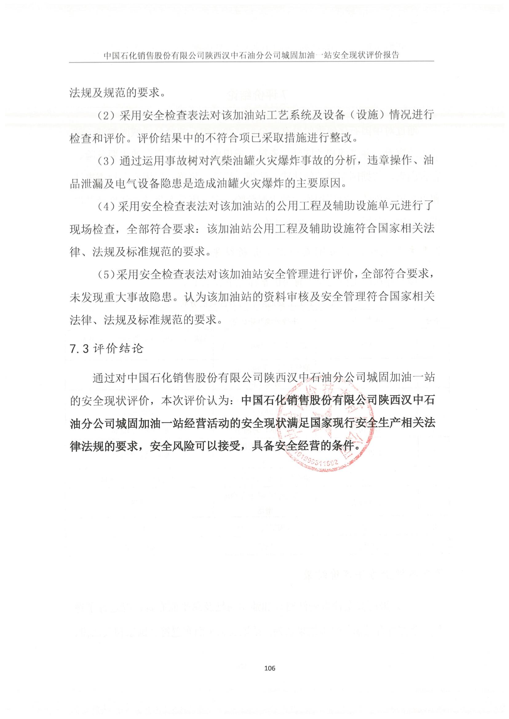 報告結(jié)論 | 評價結(jié)論:通過對中國石化銷售股份有限公司陜西漢中石油分公司城固加油一站的安全現(xiàn)狀評價,本次評價認(rèn)為:中國石化銷售股份有限公司陜西漢中石油分公司城固加油一站經(jīng)營活動的安全現(xiàn)狀滿足國家現(xiàn)行安全生產(chǎn)相關(guān)法律法規(guī)的要求,安全風(fēng)險可以接受,具備安全經(jīng)營的條件。 | ||||||