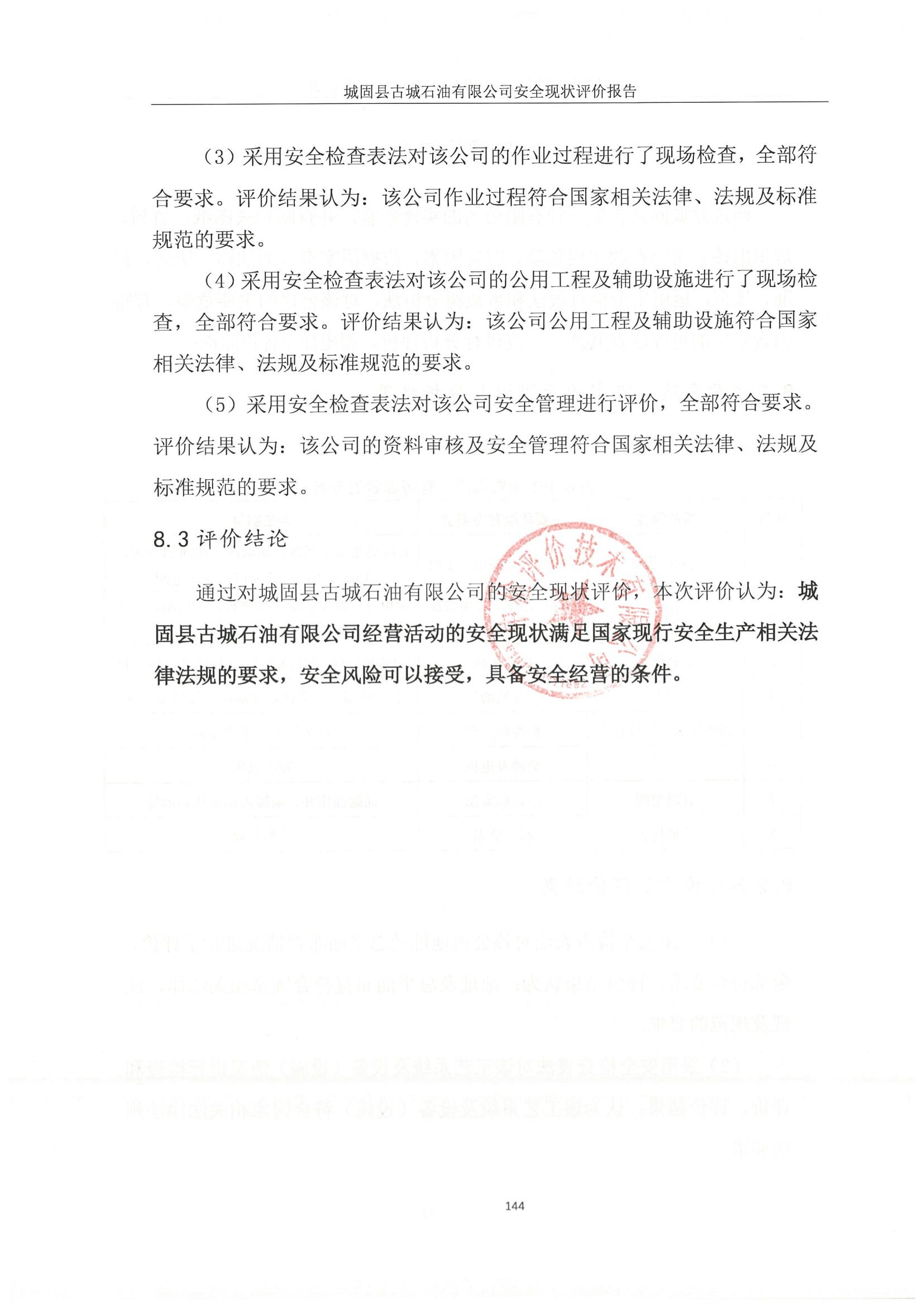報告結論 | 評價結論:通過對城固縣古城石油有限公司的安全現(xiàn)狀評價,本次評價認為:城固縣古城石油有限公司經營活動的安全現(xiàn)狀滿足國家現(xiàn)行安全生產相關法律法規(guī)的要求,安全風險可以接受,具備安全經營的條件。 | ||||||