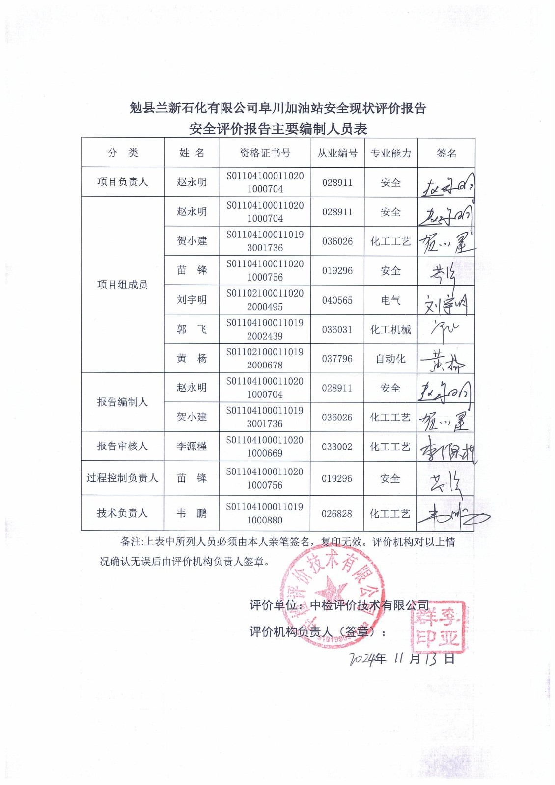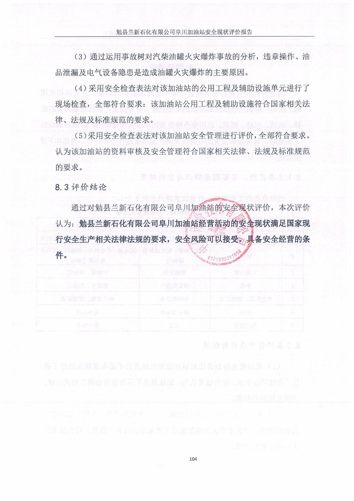 報告結論 | 評價結論:通過對勉縣蘭新石化有限公司阜川加油站的安全現(xiàn)狀評價,本次評價認為:勉縣蘭新石化有限公司阜川加油站經(jīng)營活動的安全現(xiàn)狀滿足國家現(xiàn)行安全生產(chǎn)相關法律法規(guī)的要求,安全風險可以接受,具備安全經(jīng)營的條件。 | ||||||
