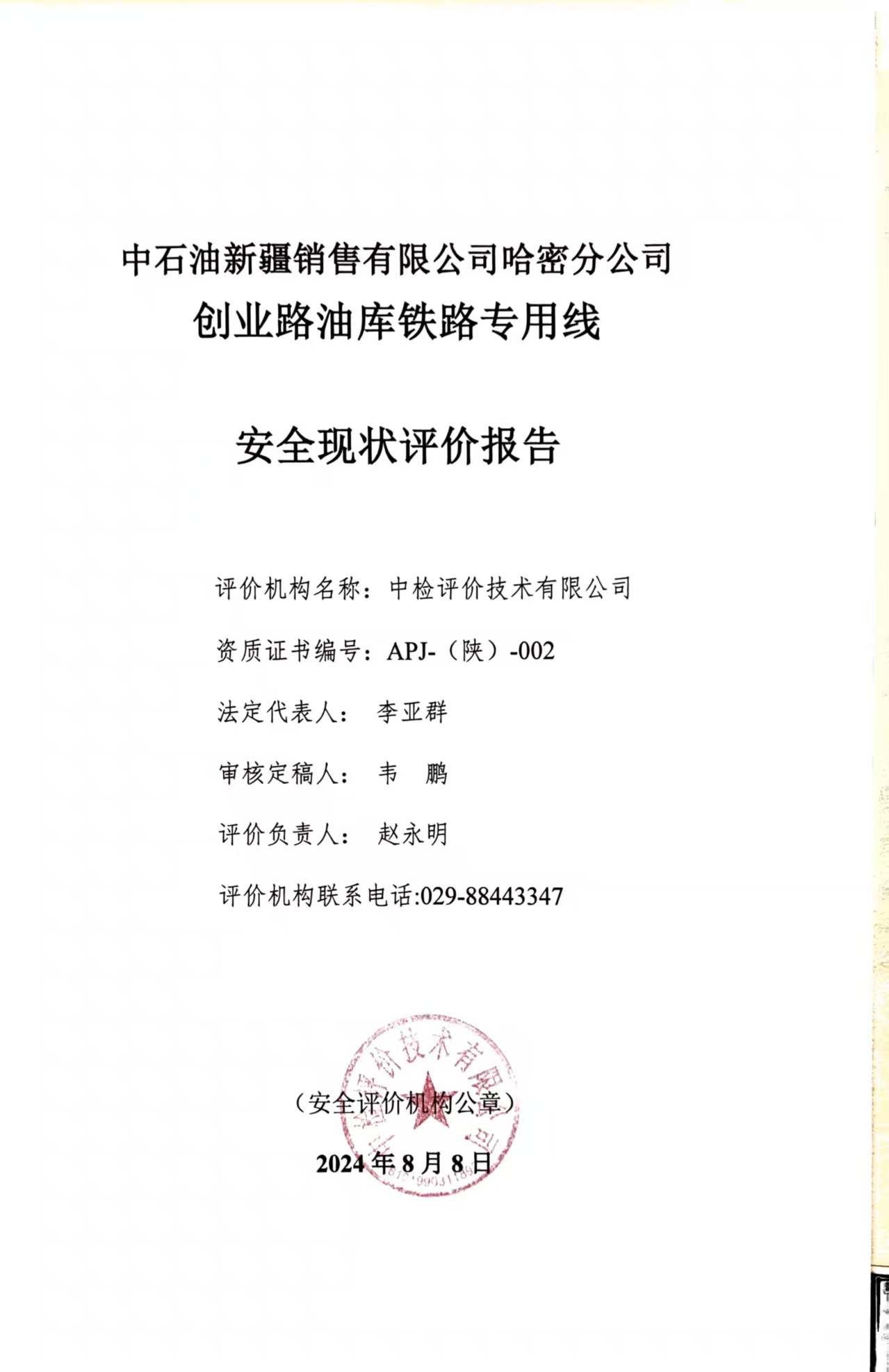 中石油新疆銷售有限公司哈密分公司創(chuàng)業(yè)路油庫鐵路專用線安全現(xiàn)狀評價報告