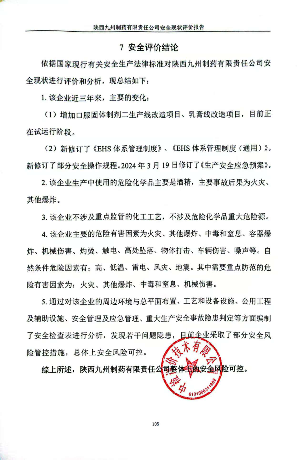 報(bào)告結(jié)論 | 陜西九州制藥有限責(zé)任公司整體上的安全風(fēng)險(xiǎn)可控。 | ||||||