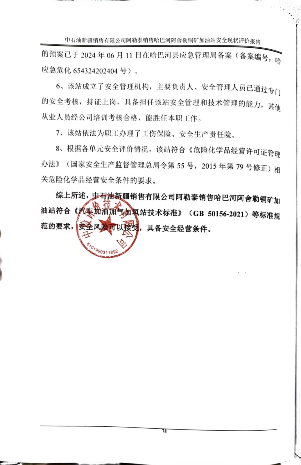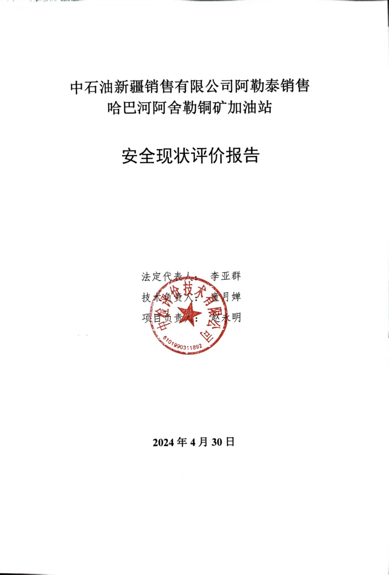 中石油新疆銷售有限公司阿勒泰銷售哈巴河阿舍勒銅礦加油站安全現(xiàn)狀評價報告