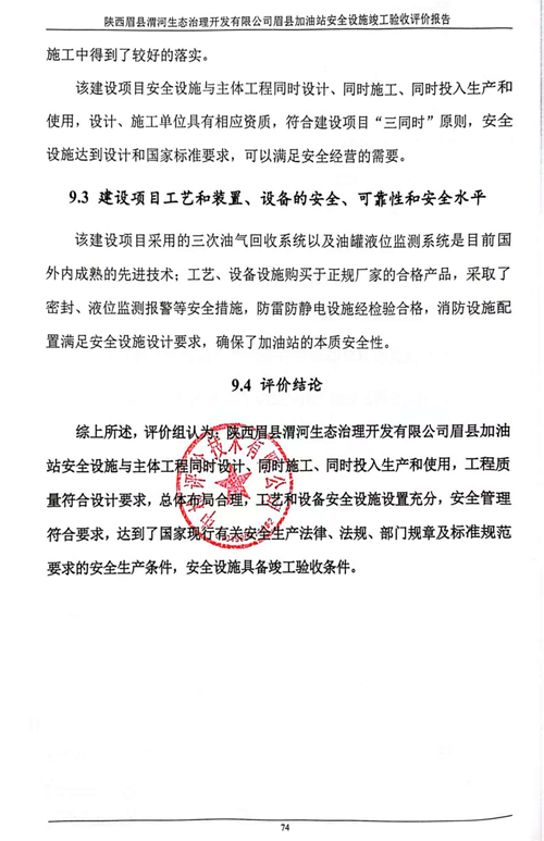 報告結(jié)論 | 陜西眉縣渭河生態(tài)治理開發(fā)有限公司眉縣加油站安全設(shè)施與主體工程同時設(shè)計、同時施工、同時投入生產(chǎn)和使用,工程質(zhì)量符合設(shè)計要求,總體布局合理,工藝和設(shè)備安全設(shè)施設(shè)置充分,安全管理符合要求,達(dá)到了國家現(xiàn)行有關(guān)安全生產(chǎn)法律、法規(guī)、部門規(guī)章及標(biāo)準(zhǔn)規(guī)范要求的安全生產(chǎn)條件,安全設(shè)施具備竣工驗收條件。 | ||||||