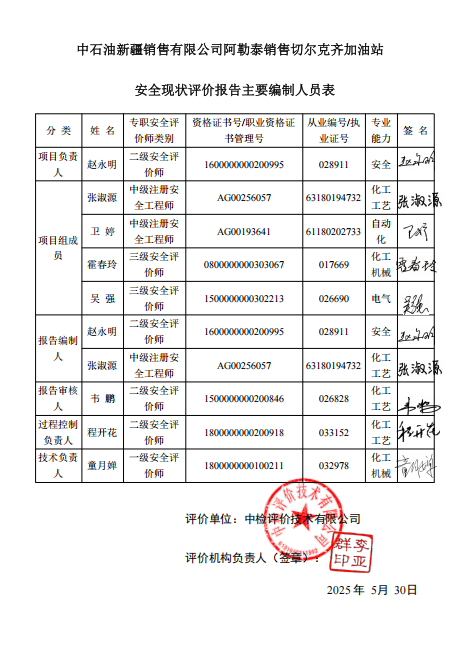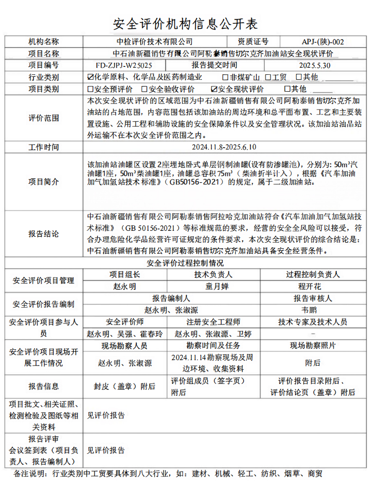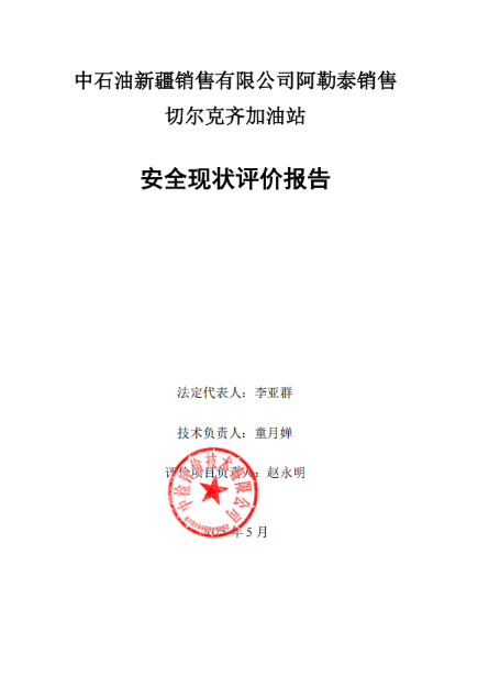 中石油新疆銷售有限公司阿勒泰銷售切爾克齊加油站安全現狀評價報告